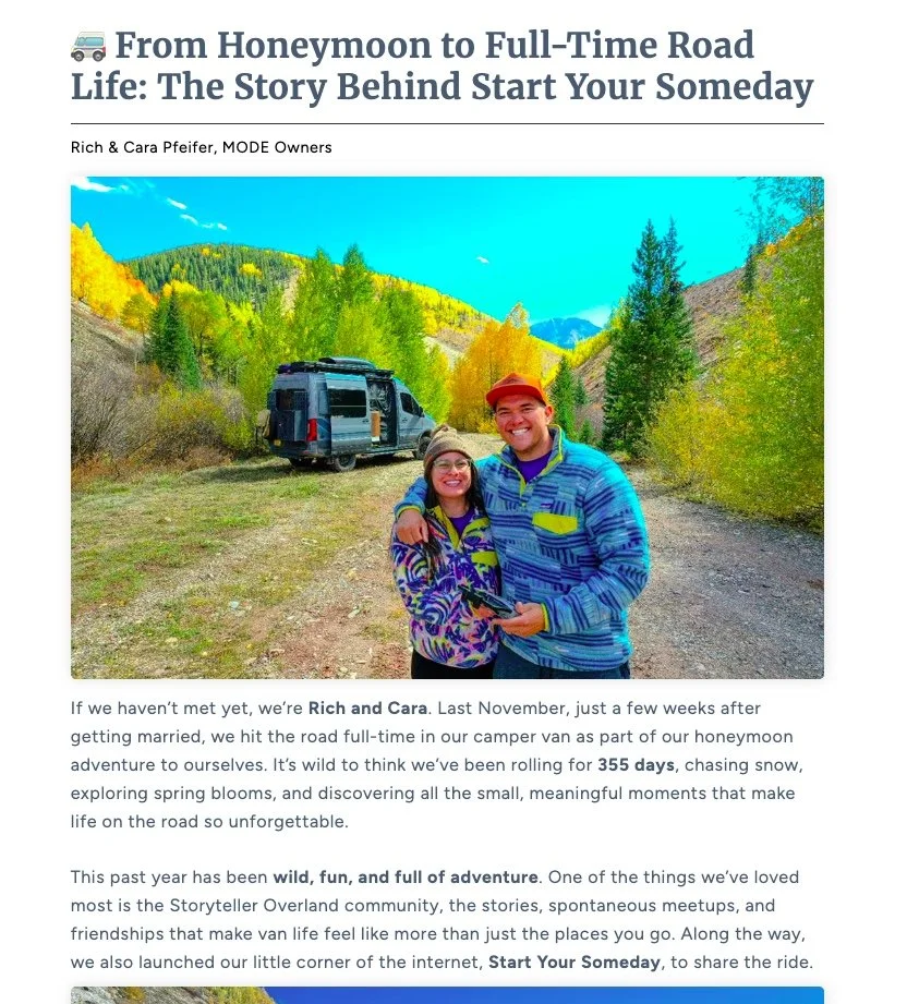 We’re newlyweds who turned our honeymoon into a full-time van life adventure. What started as a dream became Start Your Someday, our space to share stories from the road, connect through our Digital Campfire meetups, and celebrate the community that makes van life unforgettable.